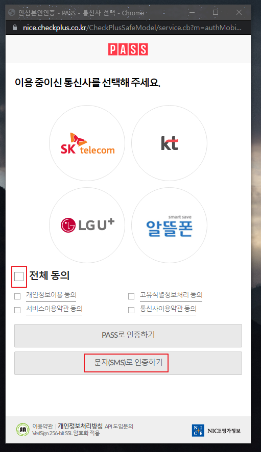 핸드폰 본인인증을 누르면 위와 같은 화면이 나옵니다. 통신사를 선택 후 전체 동의를 누르신 후 문자로 인증하기를 누릅니다.
