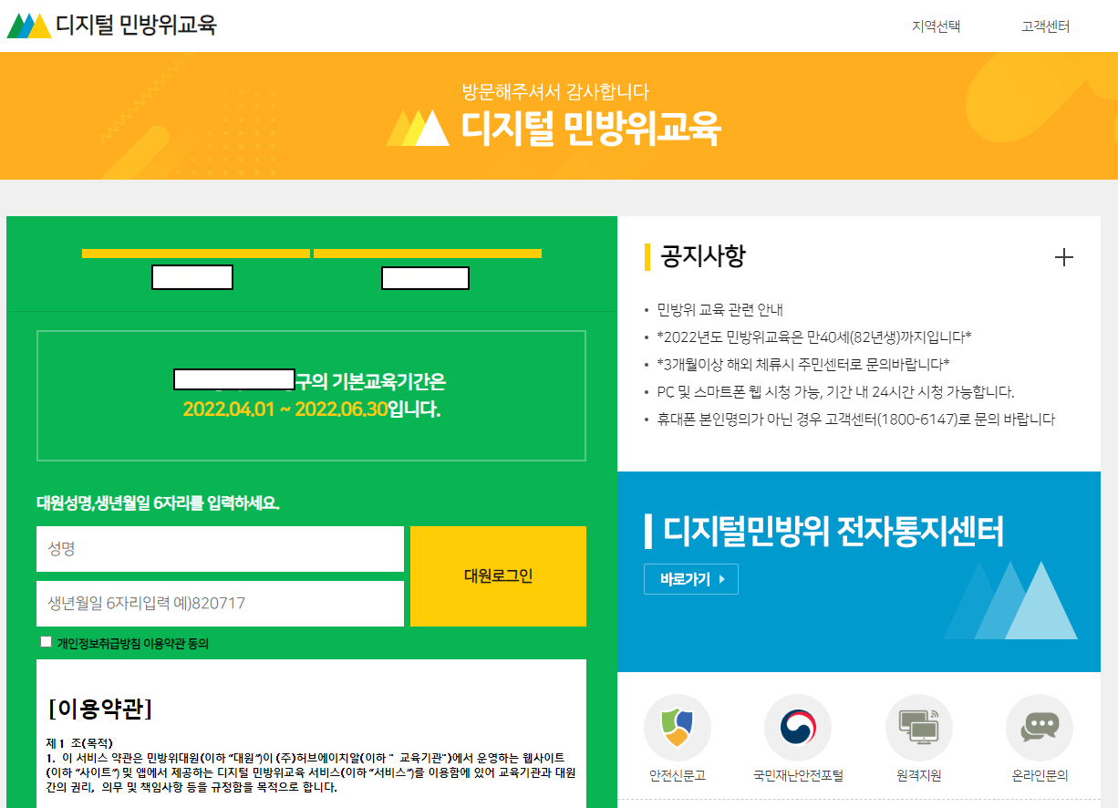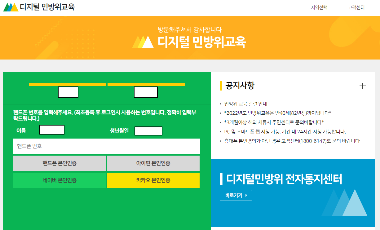 카톡으로 디지털 민방위교육을 받으라는 문자가 왔더군요.. 코로나 시국이기 때문에 온라인으로 1시간 교육을 받은 후 평가 문제 75점 이상을 받으면 이수 가능합니다.