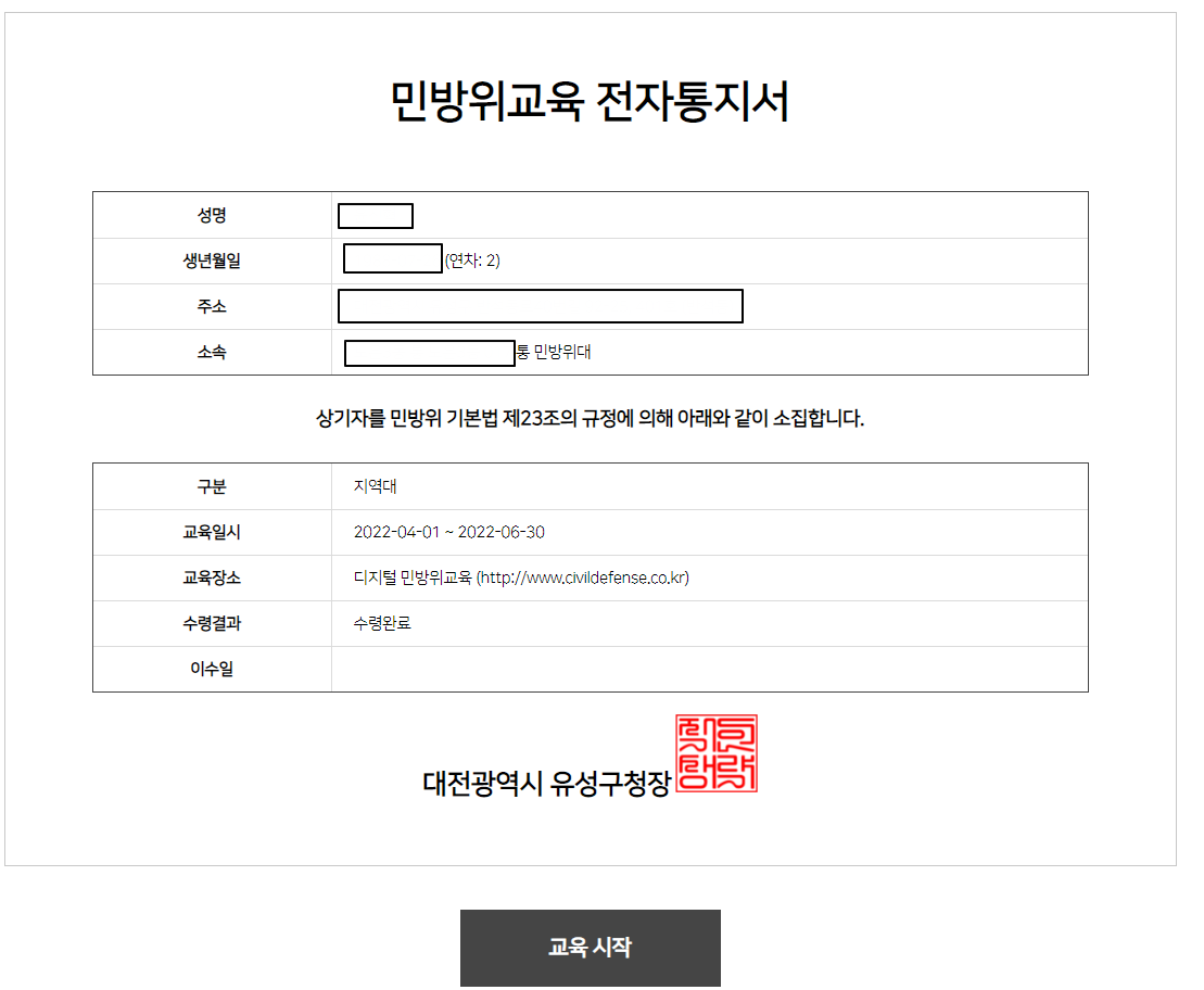 본인인증을 끝마치면 위와 같은 전자통지서가 나옵니다. 제대로 적혀 있는지 확인하시고 문제가 없으면 교육 시작을 눌러줍니다.
